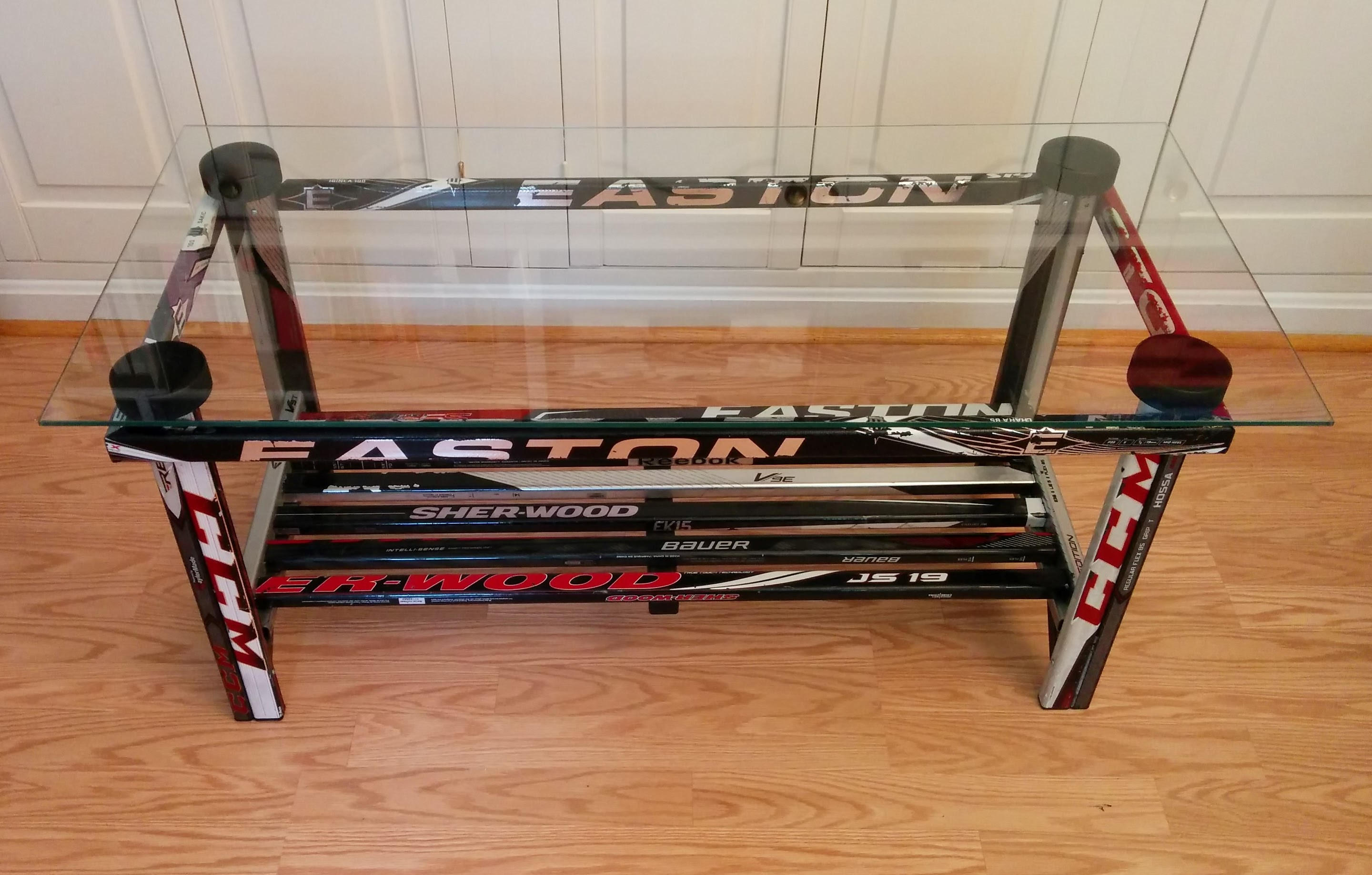 Paige hemmis is making the ultimate coffee table for hockey fans. Hockey stick table jnfunnyfarm $ 125.00. Read some tips and get to work. Made of game used sticks, real hockey pucks, and glass, its sure to accent any space. My second table i made, with a combination of broken futon wood and some plain hockey sticks i got from a old hockey stick factory. I promised everyone that i would make one, and. Some noted challenges of using composite sticks include: For the legs, stack the sticks 2×2. When autocomplete results are available use up and down arrows to review and enter to select. Red just take it out of the box! I'm totally making a coffee table version of this for anthony!! All others are built custom made to order Red just take it out of the box!