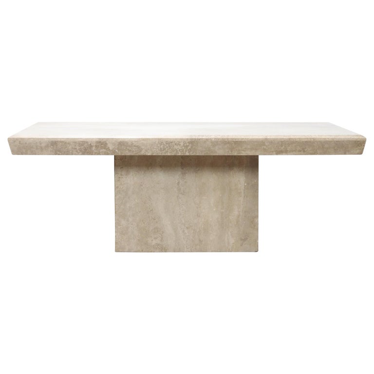 The plates are turnable so you can vary the with (115 to 155 beautiful console table made entirely made of massive travertine stone top, on 2 tubular feet also made of massive travertine stone. The travertine coffee table also features a removable circular insert from its top which exposes a hollow leg to place a plant. It is topped with polished travertine and supported by sweeping metal legs in an antiqued gold finish. 885 d x 305 h mm. A stone table will compliment almost any décor or design and will never go out of style.